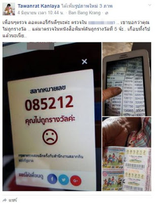 วันนี้อยากแชร์เรื่องราวไว้เป็นอุทาหรณ์สำหรับ คอหวย ทุกคน เป็นเรื่องจริงจากคุณ Tawanrat Kanlaya ที่เมื่อนำล็อตเตอรี่ ไปตรวจในเว็บไซส์เว็บหนึ่ง ในเว็บบอกว่าไม่ถูกรางวัล แต่พอเอามาตรวจในหนังสือพิมพ์กับพบว่าถูกรางวัลที่ 5 เกือบพลาดโยนทิ้งไปซะแล้ว